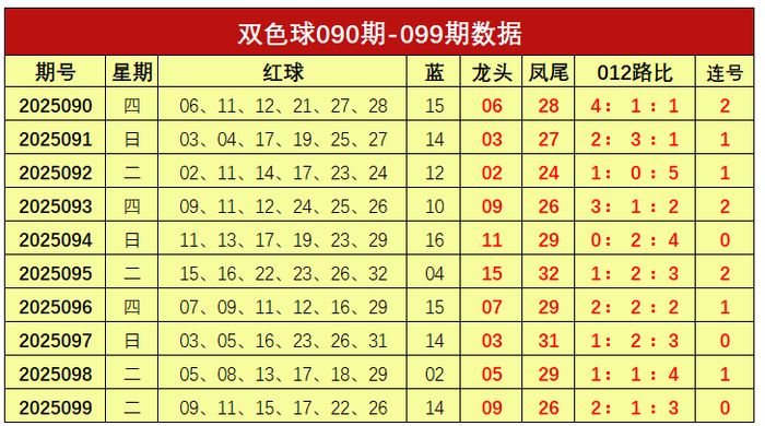 双色球第2025099开奖奖号:红球09、11、15、17、22、26,蓝球14。龙头09,凤尾26,012路比为2:1:3,未开出连号。