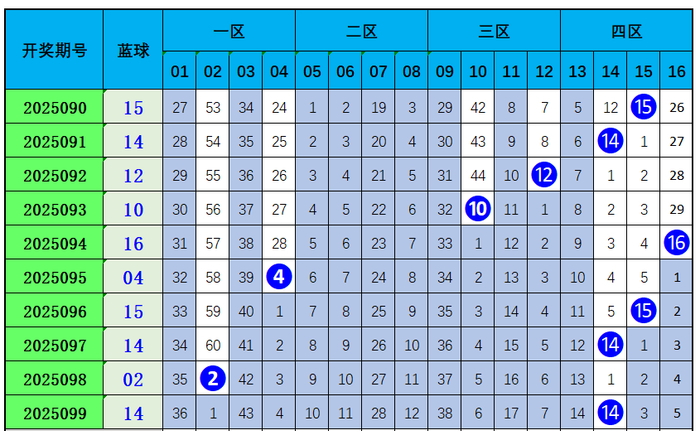 上期开出偶数蓝球14,近10期开稀疏数号码2次,开出偶数号码8次,奇偶比2:8,近期偶数奖号出号较热。本期展望开稀疏数号码:09。